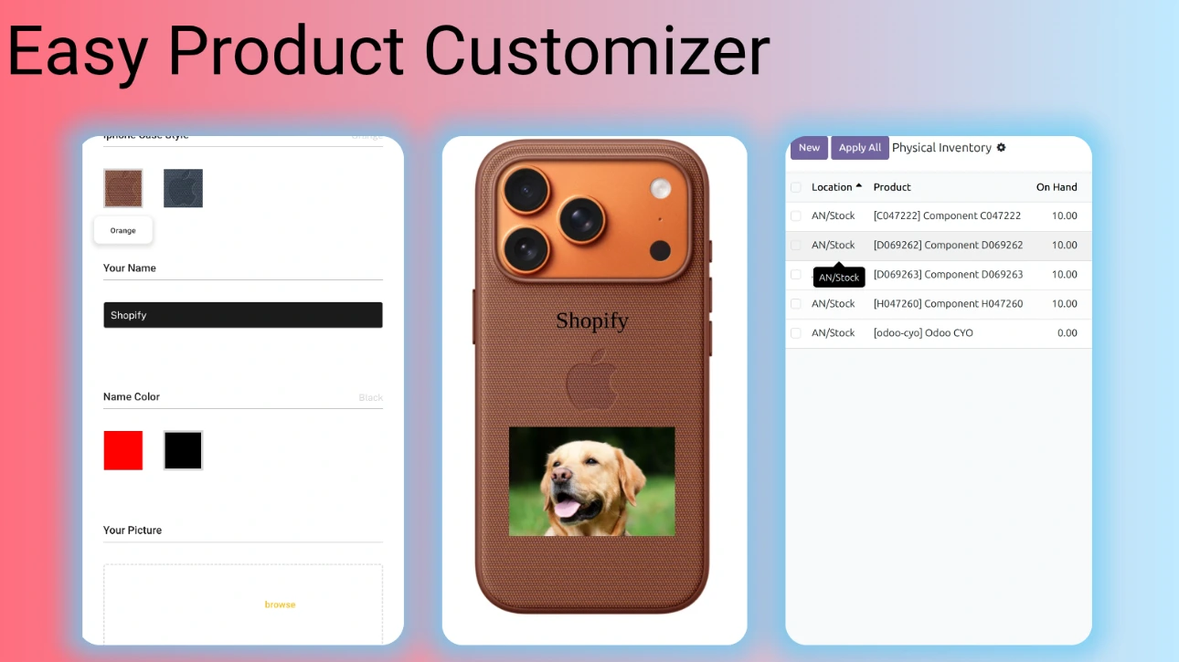 Live preview product customizer with Text Engraving, Image, Color, File Upload. It can support the Odoo and Shopify. And in customer site is chosen by components, in background there is Manufacture order and Component Inventory tracking.
